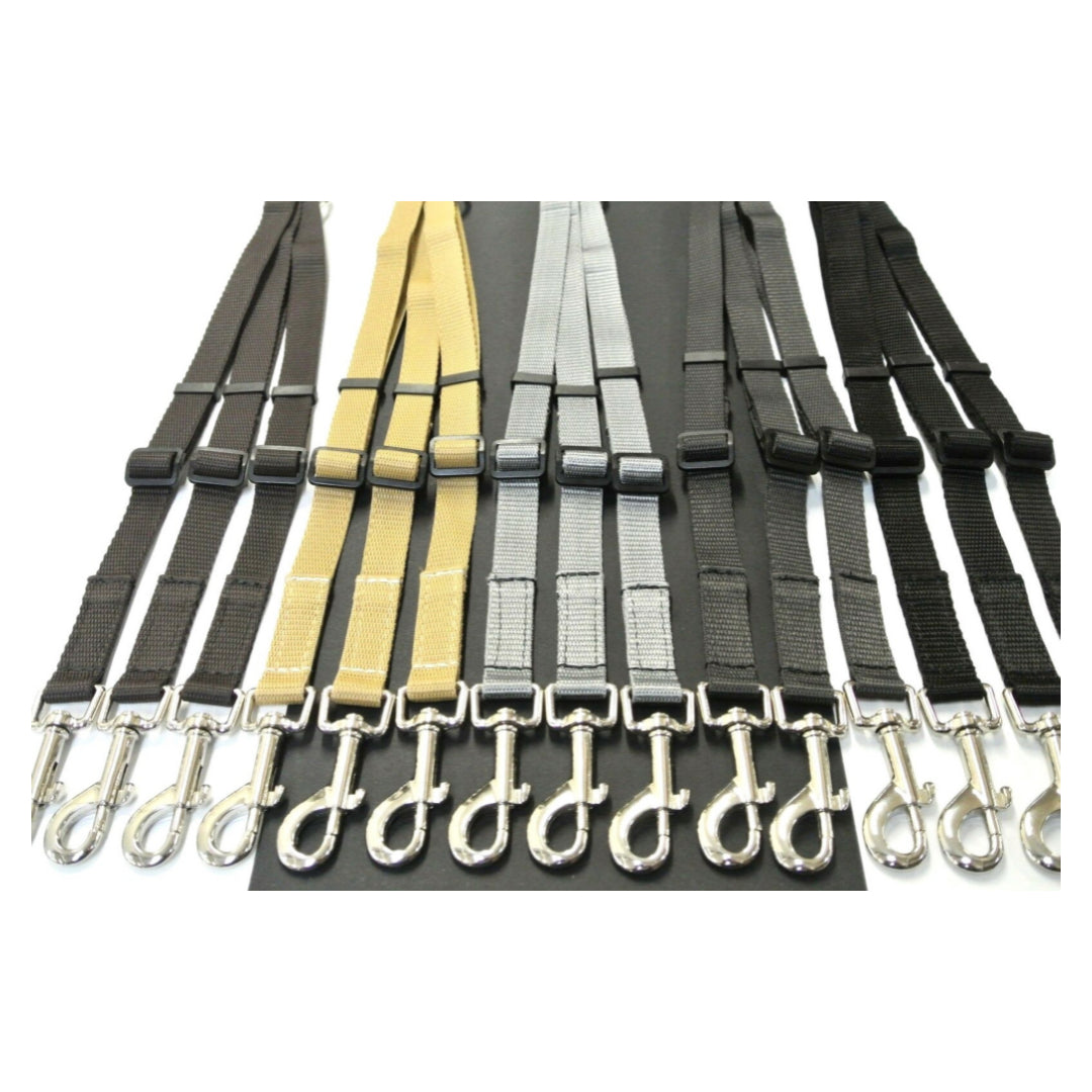 Using 20mm strong durable webbing and a welded nickel plated O-ring. With a sewn in 20mm heavy duty nickel plated trigger clip. Each side can be adjusted from 17" - 26" (43cm - 66cm). Great for walking 3 dogs on 1 lead available in all colours. Each lead is 66cm long at its maximum length to ensure that your dogs are not too close together when walking. Please feel free to ask any questions about the product via email, phone or on Facebook messenger.