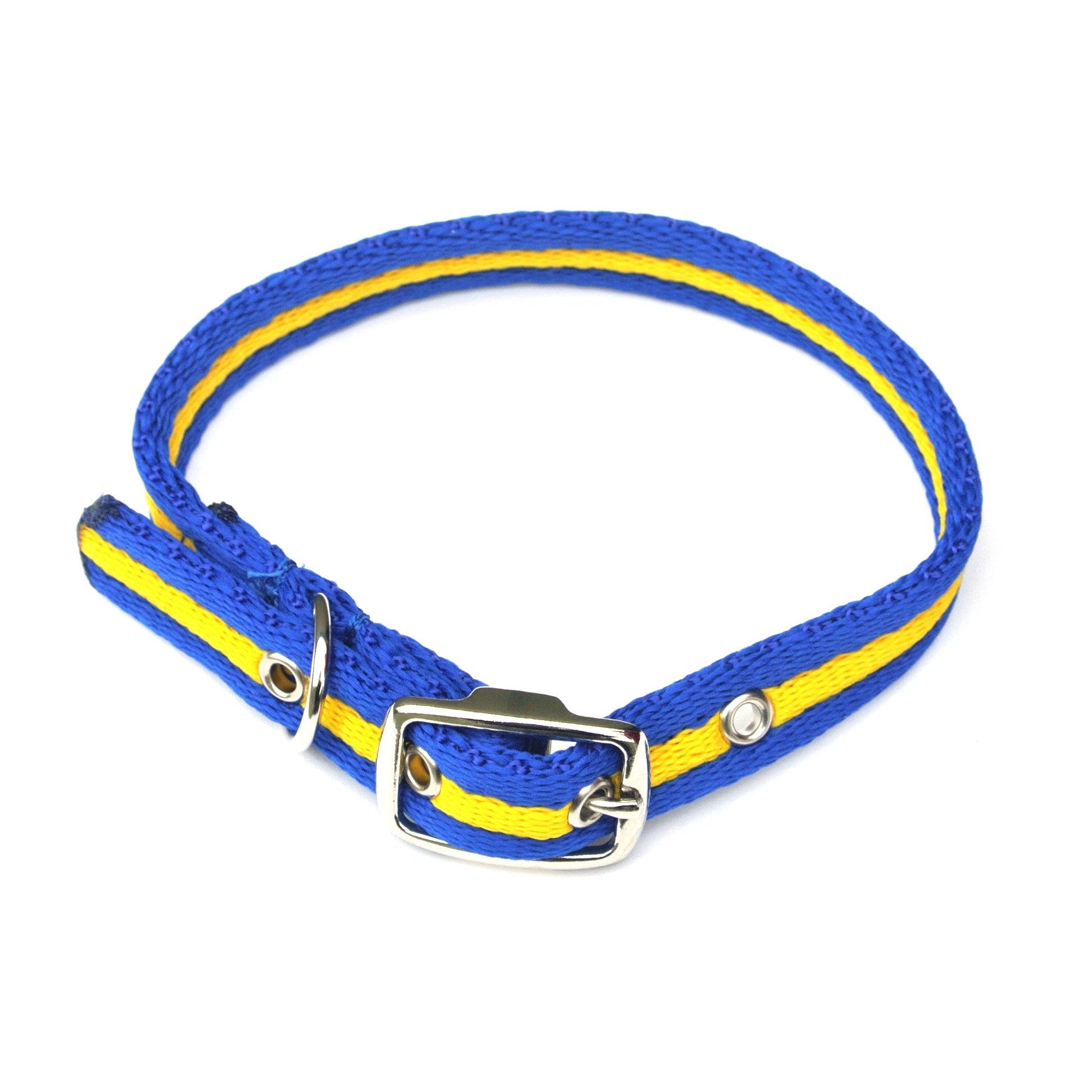 Using 20mm polyester air webbing which is 5mm in thickness making these collars soft, strong and durable. Complete with a nickel plated caveson buckle and a sewn in 20mm d-ring to attach your lead to. Finished off with 5mm pressed nickel plated eyelets. Available in X-small (10" - 13") neck size and Small (13" - 16") neck size. Available in a wide range of solid and 2 toned colours.