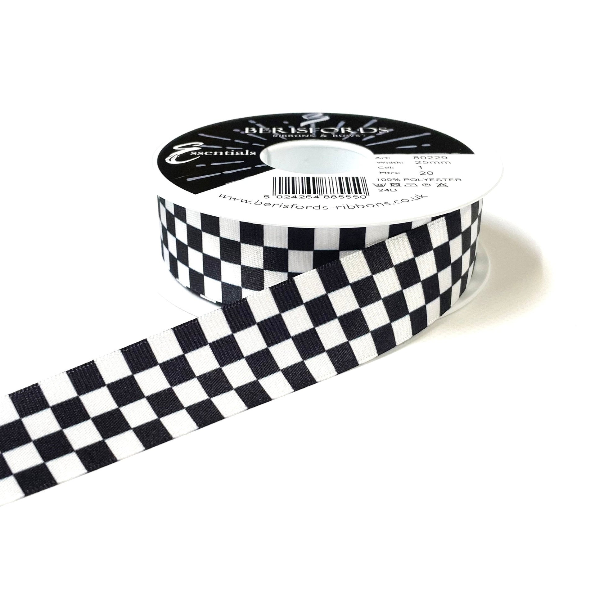 Chequered Ribbon Flag Black and White Check Berisfords Satin 15mm 25mm Wide