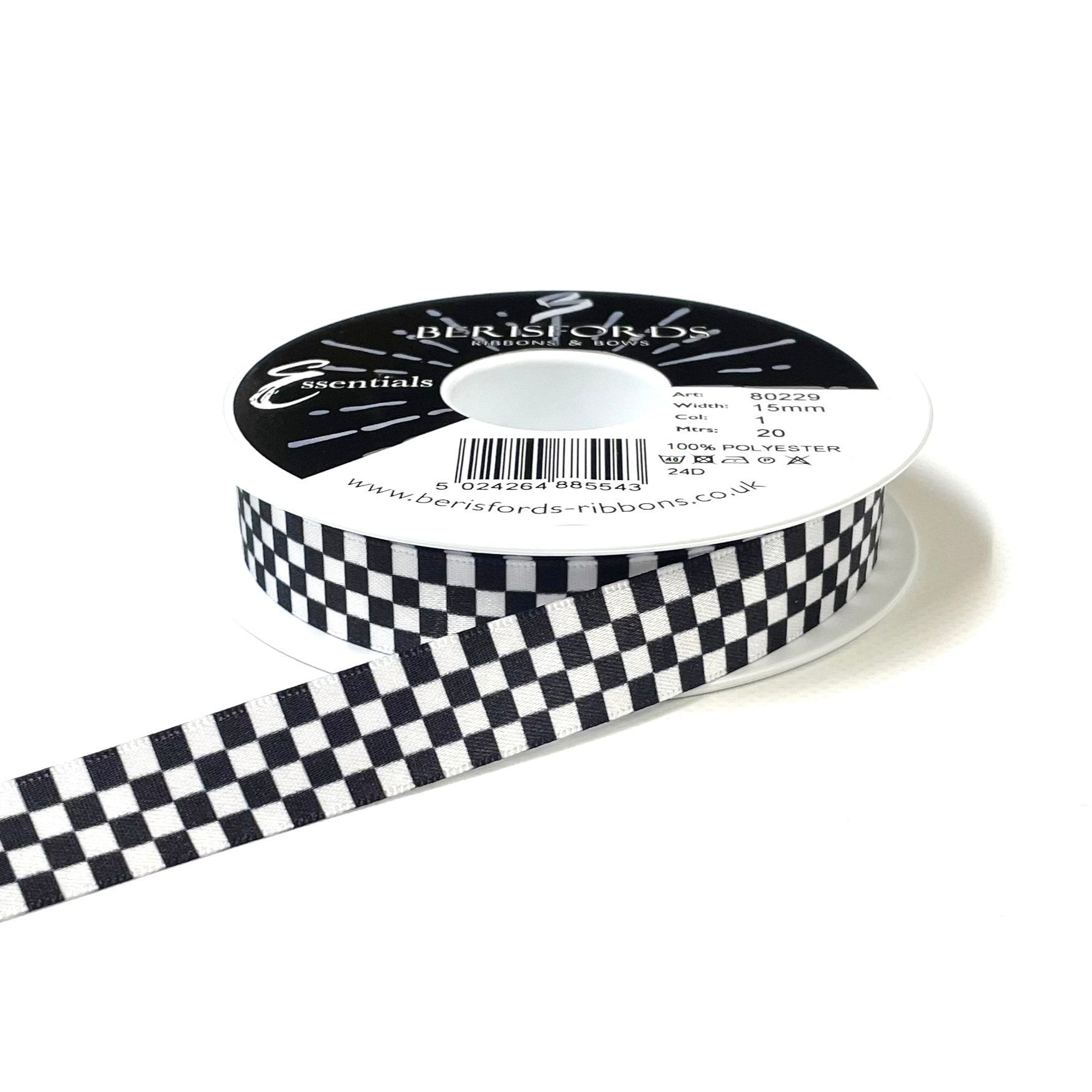 This black and white chequered flag ribbon is 100% Polyester. Available in 15mm and 25mm widths, and in lengths of 1 metre, 2 metres, 5 metres, 10 metres and 20 metre roll.