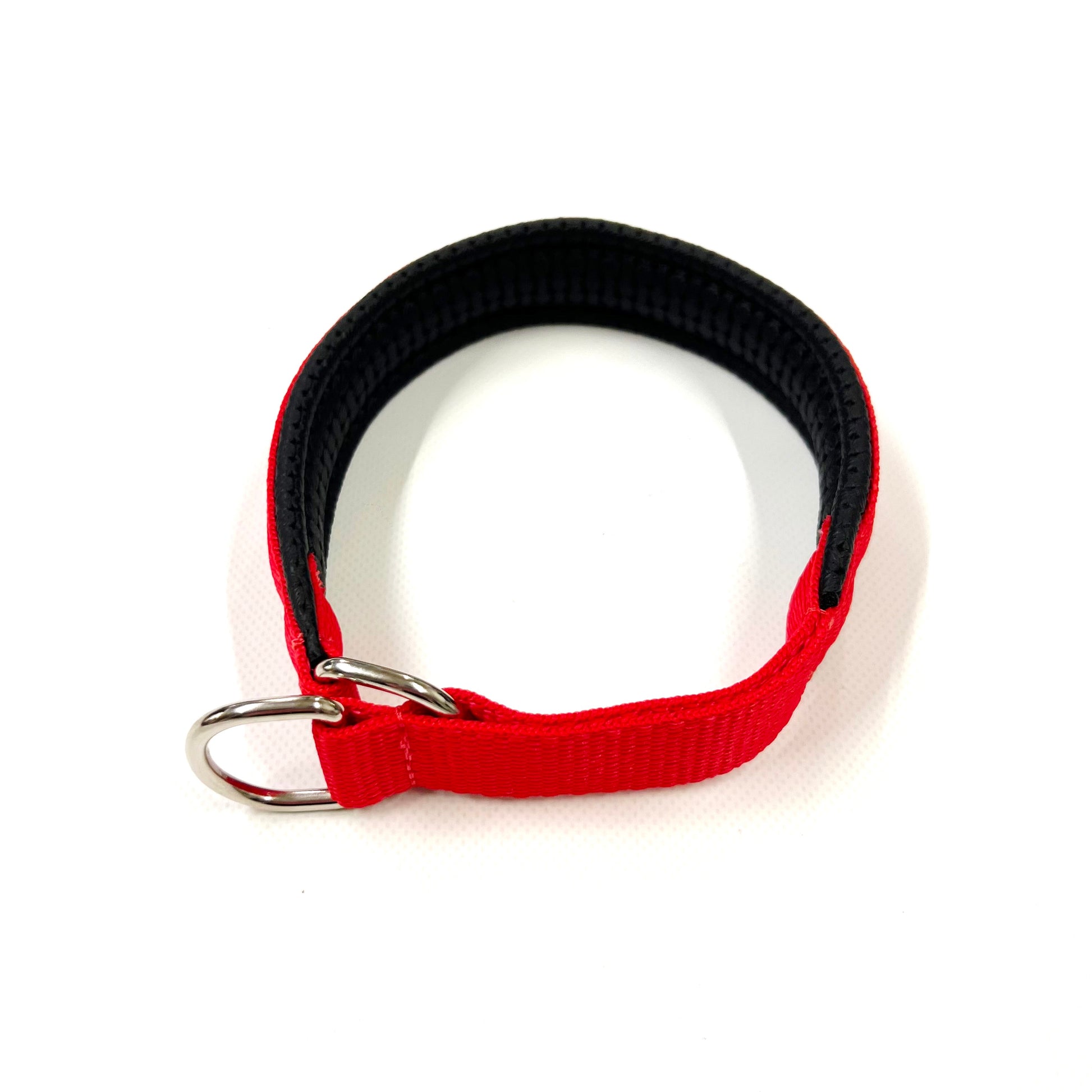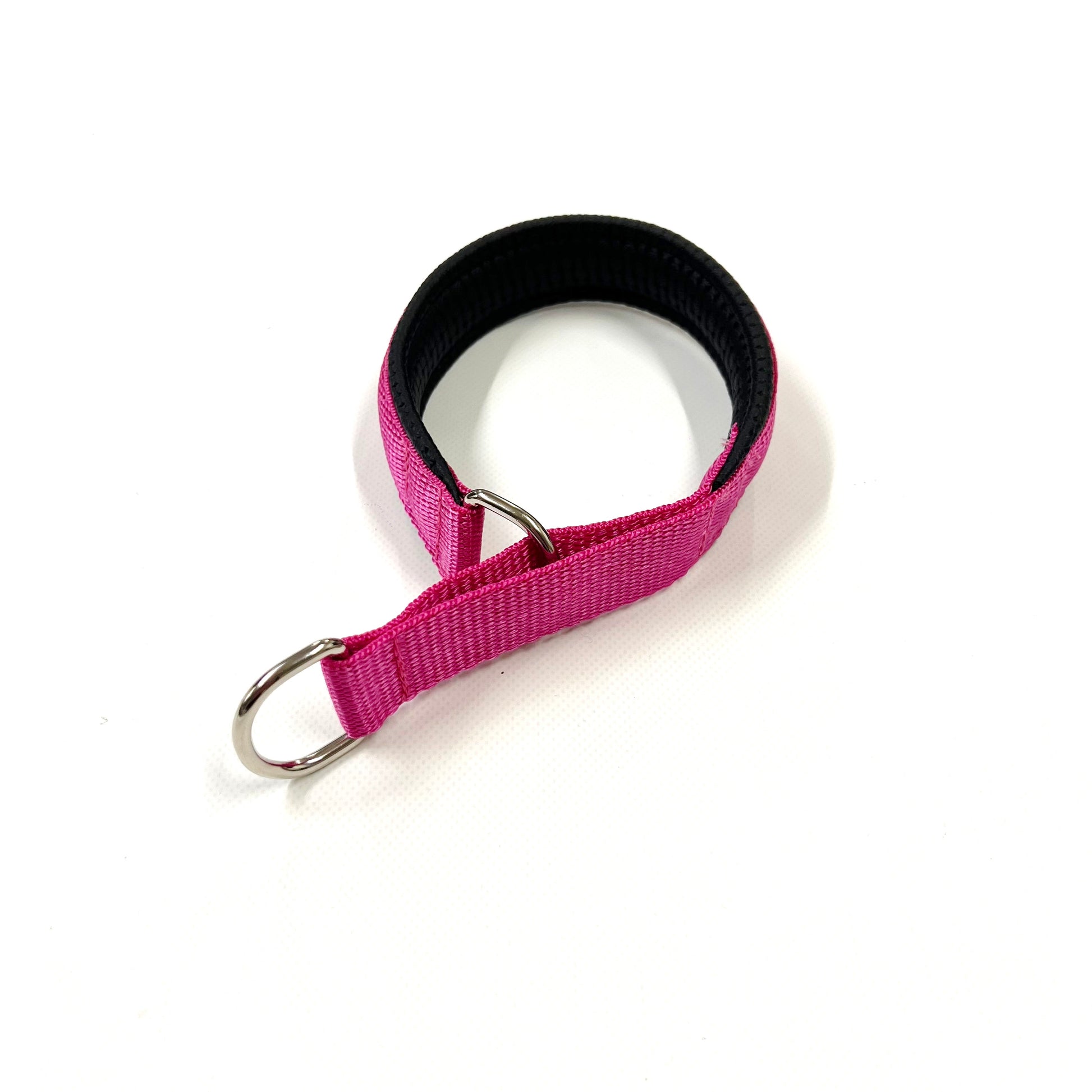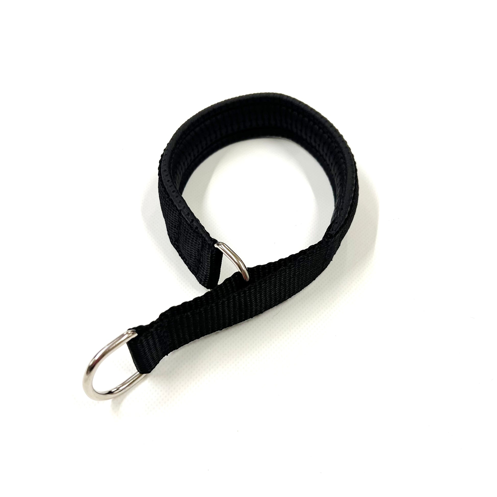 Using 25mm polypropylene webbing which is sewn on to the soft padding, with a 25mm Nickel Plated D-ring sewn on each end. The slip collar has a size range between 3 inches due to the design of the collar, with the D-ring being placed inside the slip of webbing, which purposefully limits it`s range.
